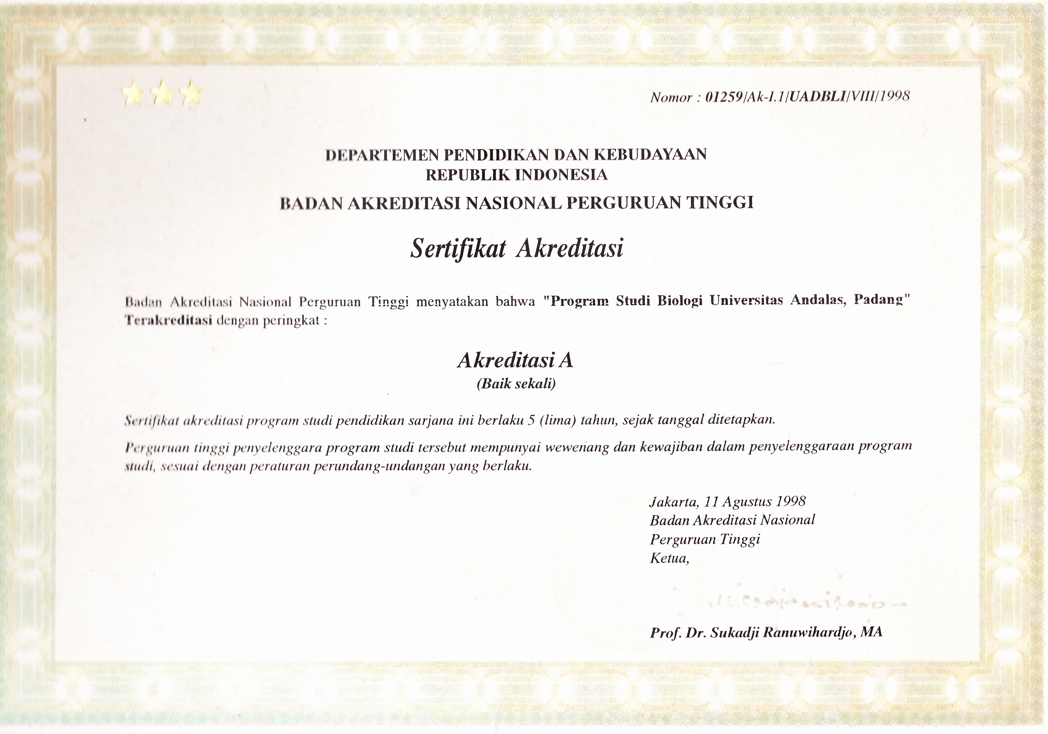 Sertifikat Akreditasi Biologi periode 1998-2003 ( Program Studi Sarjana / S1 )