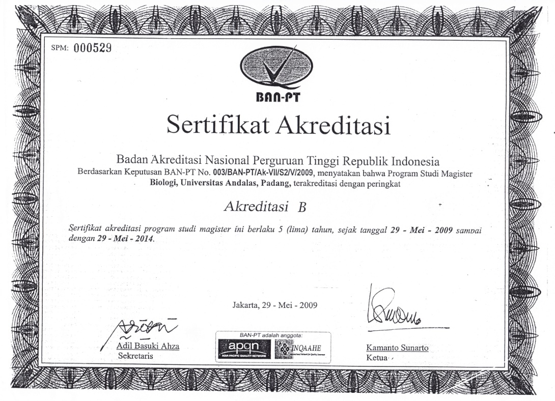 Sertifikat Akreditasi Biologi periode 2009-2014 ( Program Studi Magister / S2 )