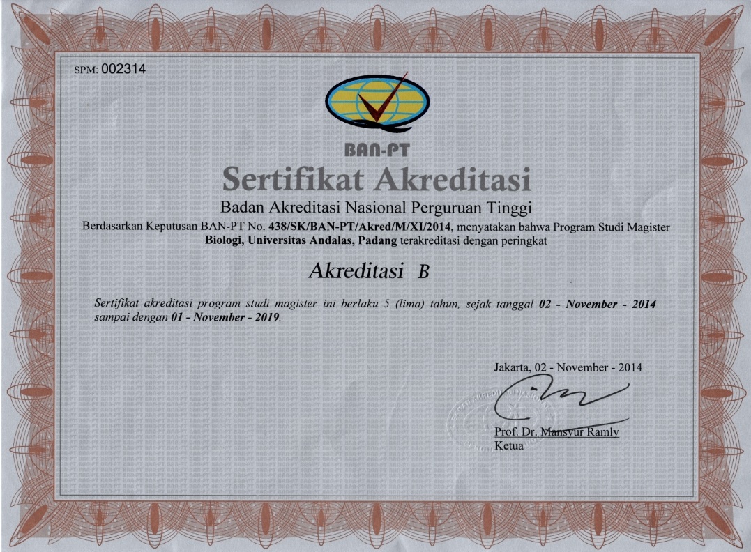 Sertifikat Akreditasi Biologi periode 2014-2019 ( Program Studi Magister / S2 )