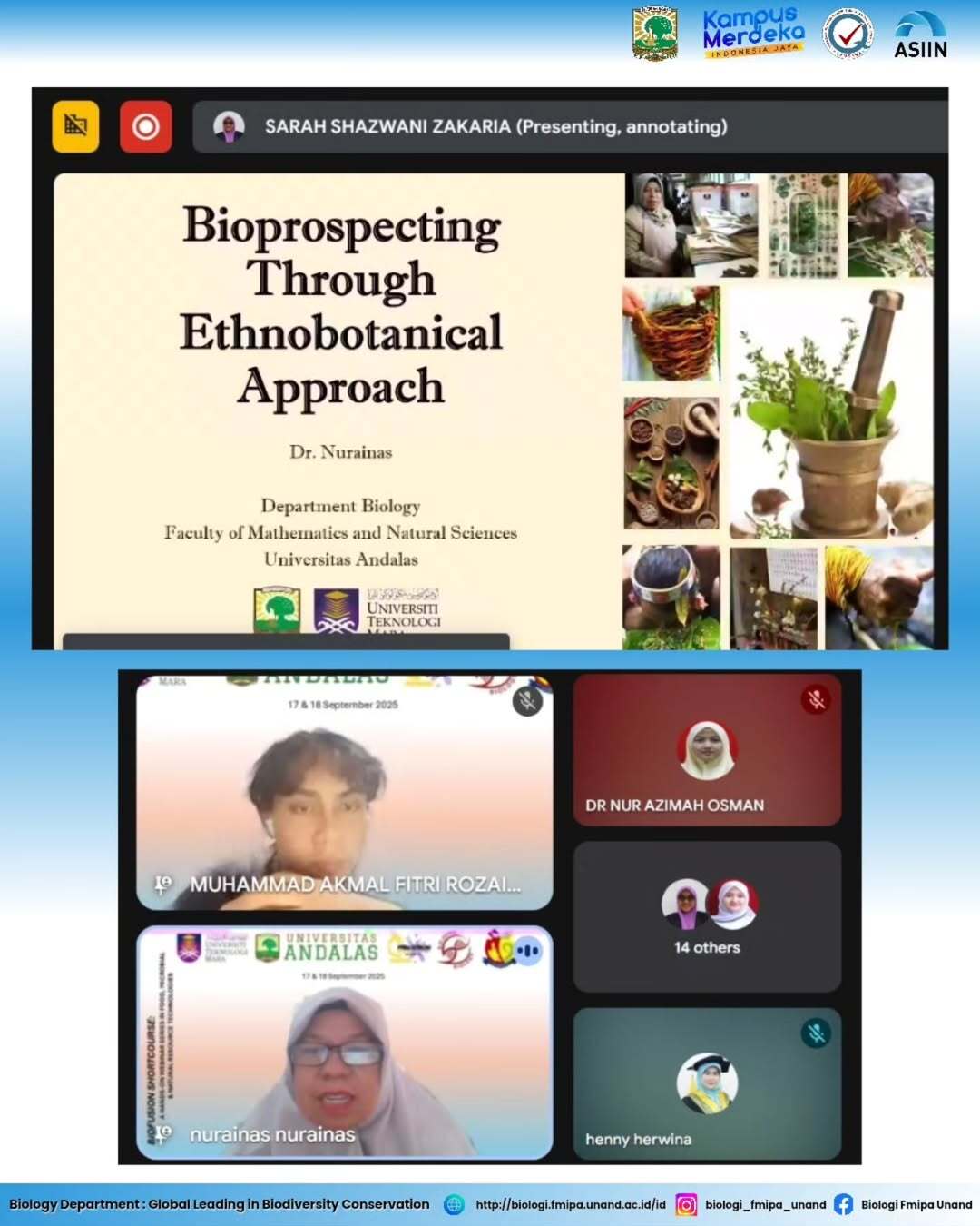 Rangkaian kegiatan dimulai dengan Seminar dan Short Course yang dilaksanakan secara daring melalui Google Meet pada17-18 September 2025. Dosen Departemen Biologi, Dr. Nurainas ikut berpartisipasi sebagai pembicara dengan judul “Bioprospecting Through Ethnobotanical Approach”.
