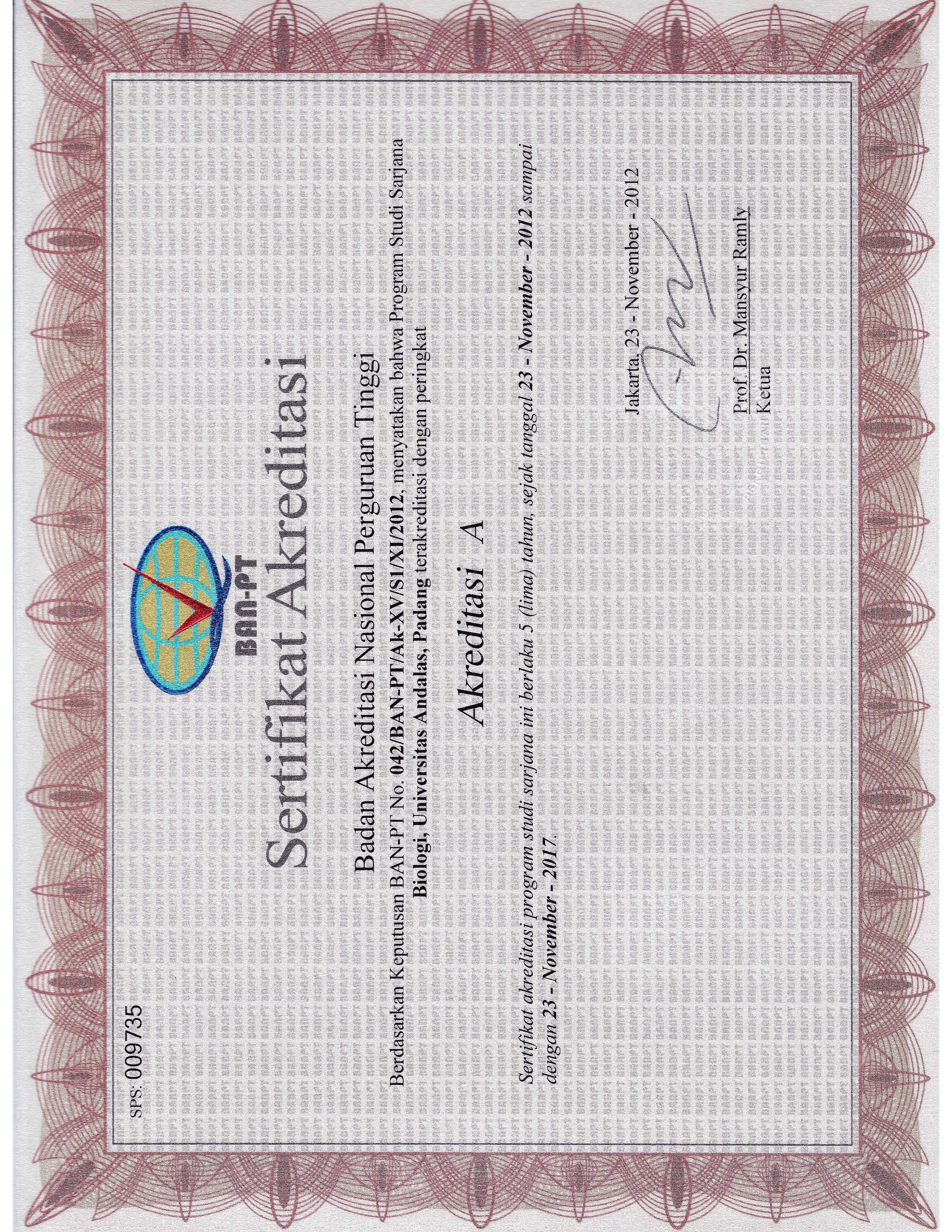 Sertifikat Akreditasi Biologi periode 2012-2017 ( Program Studi Sarjana / S1 )