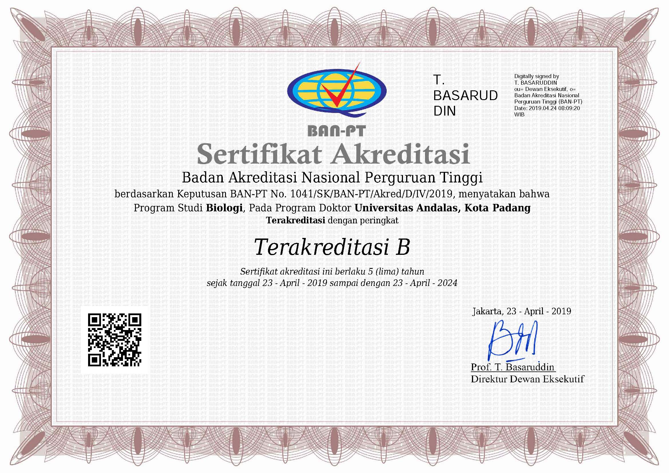 Sertifikat Akreditasi Biologi periode 2019-2024 ( Program Studi Doktor / S3 )